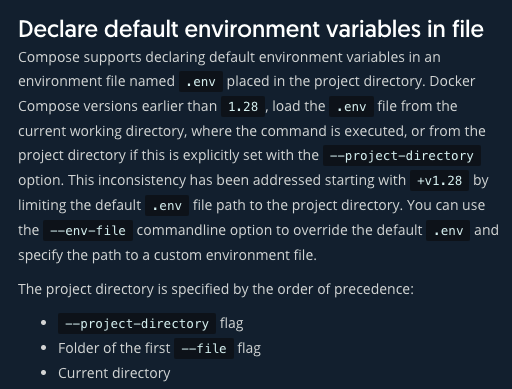 이러한 모호함을 1.28 이상의 버전에서는 .env의 default path를 project directory로 제한하는 것으로 개선하였습니다. --env-file 옵션을 이용하여 기본 .env default path를 override 할 수 있습니다.