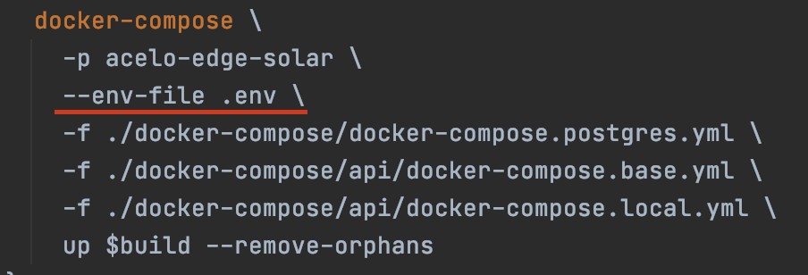env file을 제대로 인식 시켜주지 못하고 있기 때문에 이에 대해 명확히 설정을 해 줄 필요가 있다. compose에 사용되는 파일이 root project directory에 존재하기 때문에, docker-compose command 를 실행시킬 때, --env-file flag를 이용하여 명확하게 내가 사용하고자 하는 .env를 아래와 같이 명시해주었다.