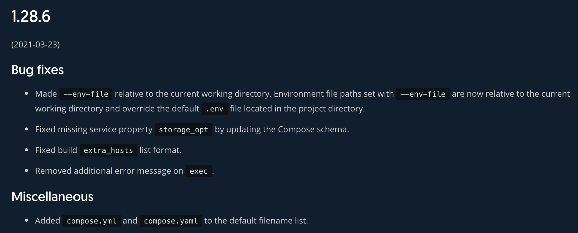 docker-compose 1.28.6 version release note를 보면 --env-file flag는 현재 작업중인 directory를 참조하도록 고쳐졌다고 한다.